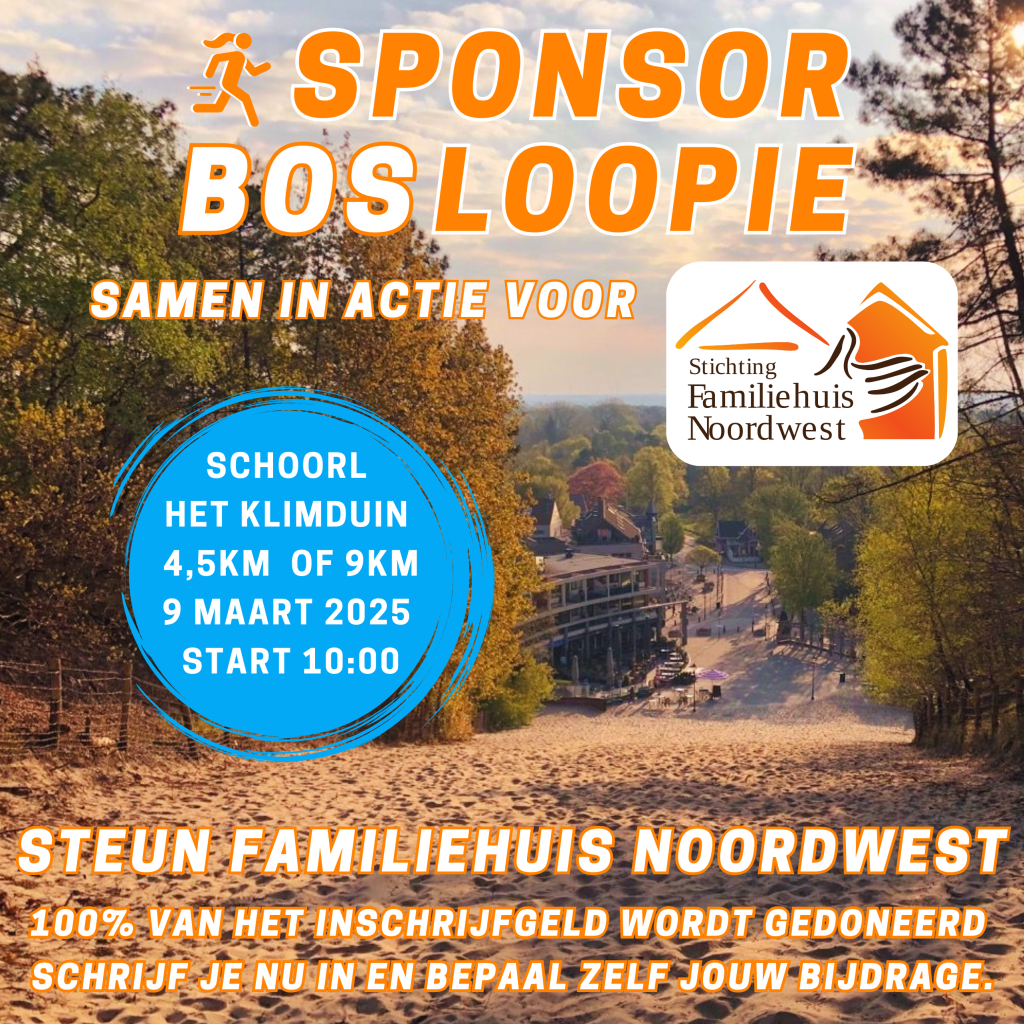 Op zondag 9 maart 2025 is het weer zover: het Sponsor Bosloopie! Dit jaar lopen en wandelen we voor een prachtig doel: Familiehuis Noordwest in Alkmaar een onderdeel van Ziekenhuis Noordwest. 100% van het inschrijfgeld gaat rechtstreeks naar deze organisatie, die een thuis biedt aan families van ernstig zieke patiënten.